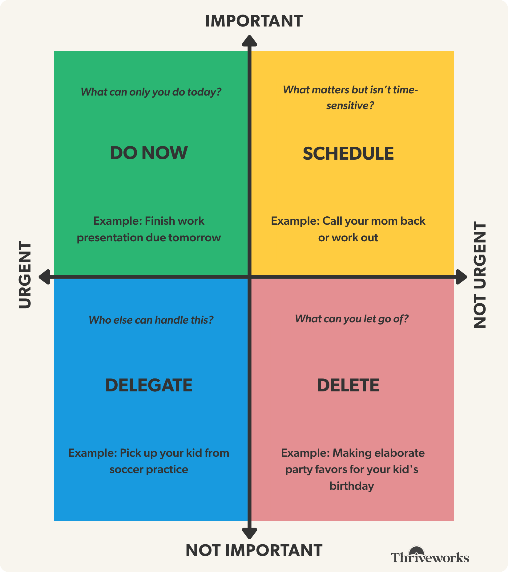 - Urgent and important: Do right now or soon